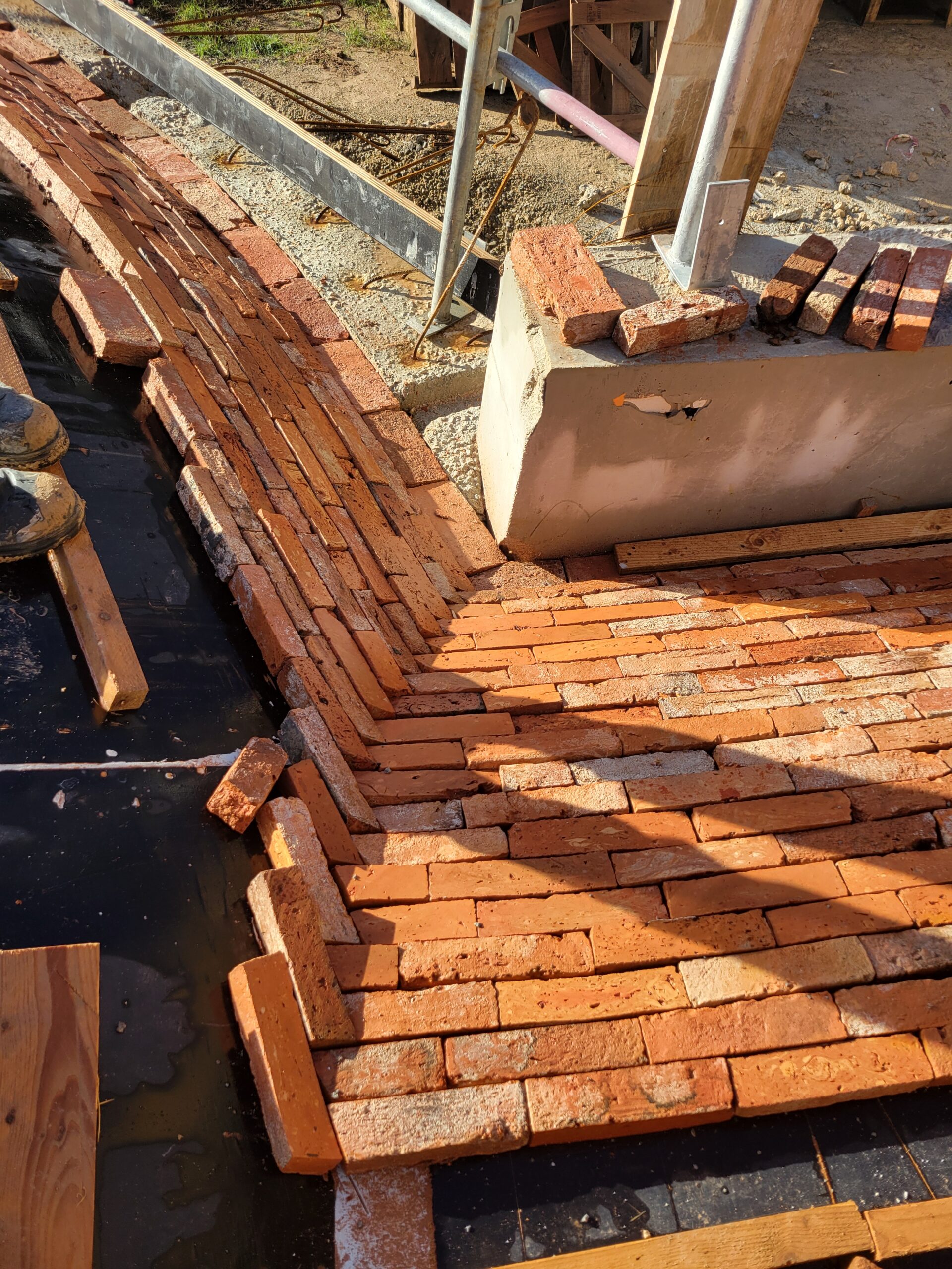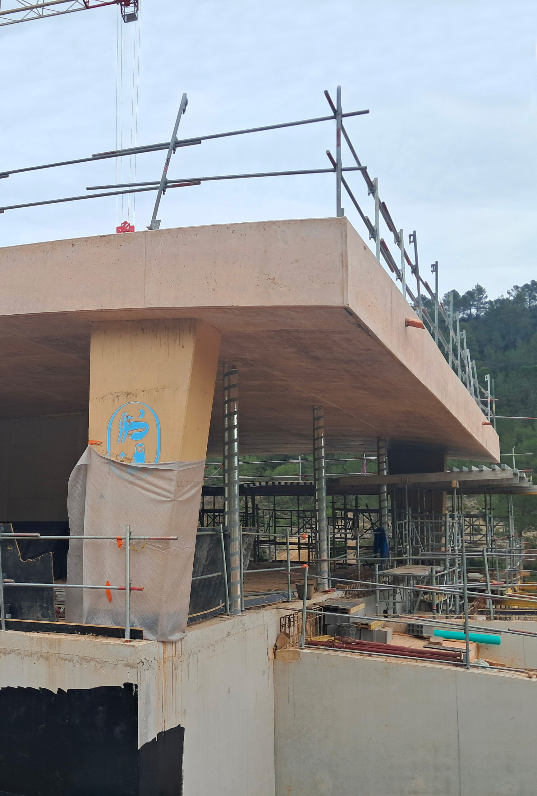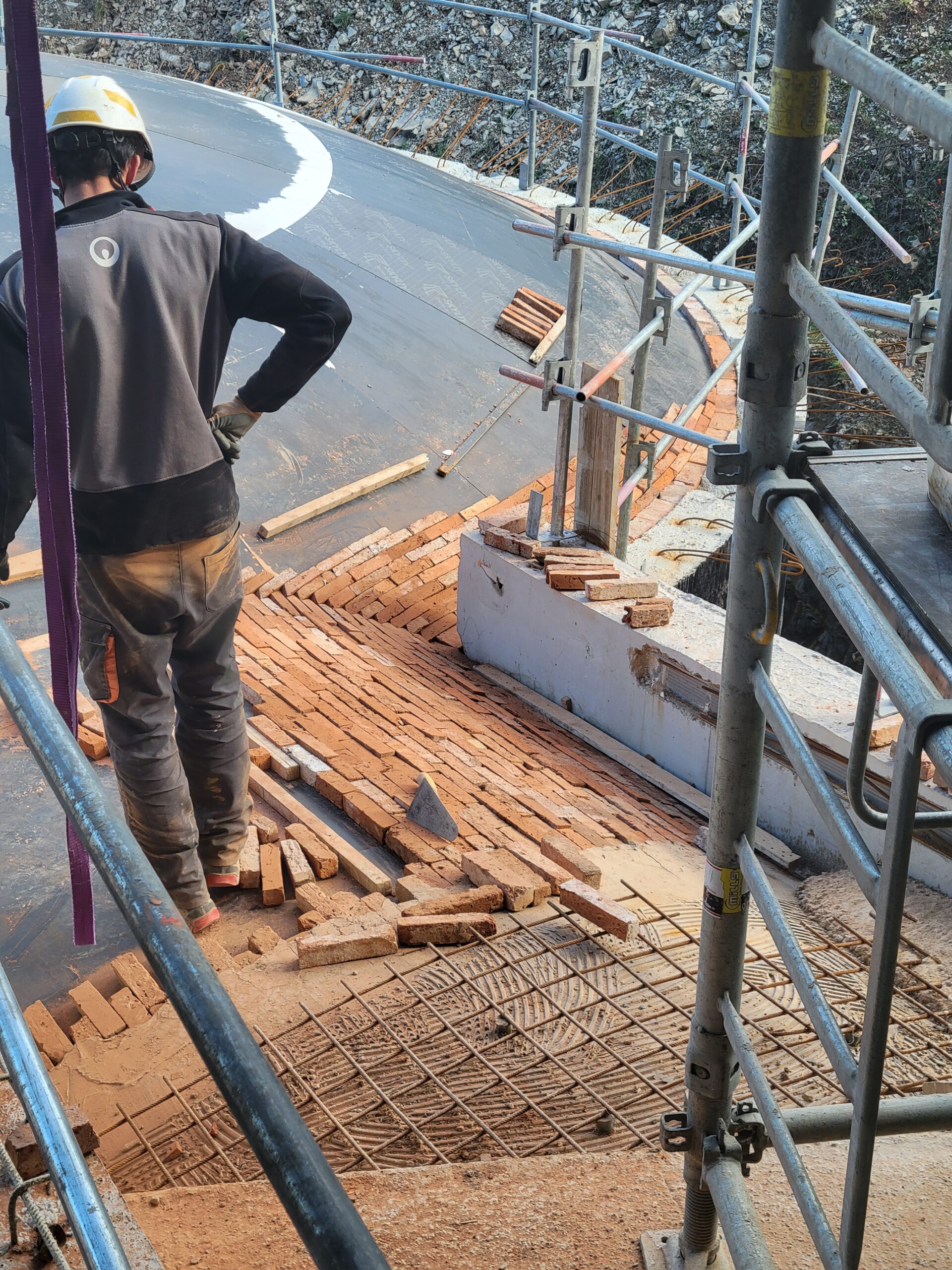 Réalisation du gros oeuvre en murs béton brut teinté. Décoffrage de la voûte béton. Mise en oeuvre des briques en coffrage perdu au niveau des Chai d'élevage.